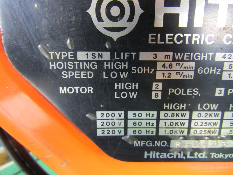 1ton 2点ボタン 揚程3m トロリー付 製番8404331002
